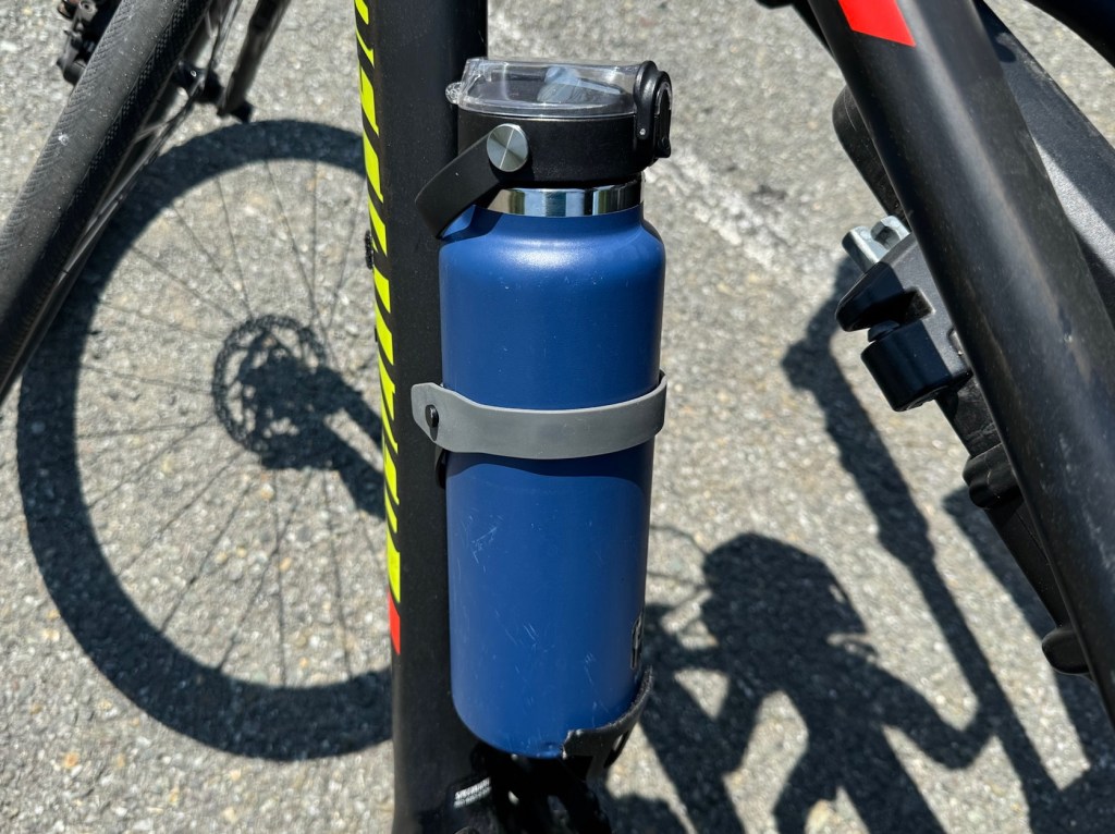 When I’m going on a long ride, I find that the standard water bottles that fit in a standard holder on most bikes. Just don’t hold enough liquid to get me through the entire ride. I have a 40 ounce Hydro flask water bottle and was able to find this large water bottle holder that would take that and larger. It mounts easily to the bike frame with the same type of screws every other water bottle holder uses. The rubber strap accommodates a variety of sizes of containers. When I first started using this, I did notice a little bit of a rattling noise, which was annoying. I added some of the fuzzy side of Velcro tape to the inside of the holder and that solve the problem. A little bit of felt also probably solved that problem. The strap secures the bottle very well and even though I have written on some rough surfaces, I’ve never had the bottle fall out.